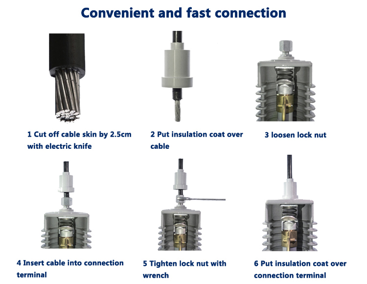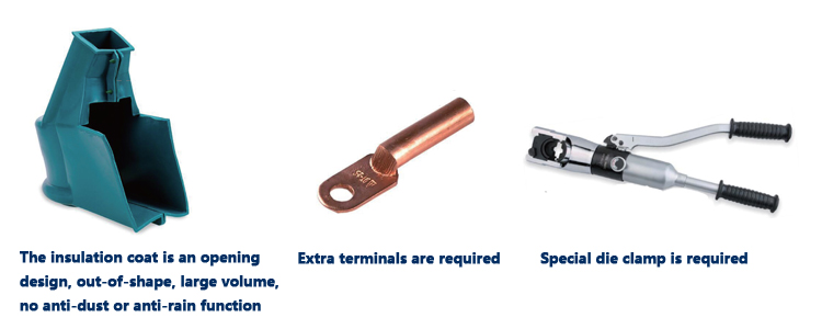 Compared with normal product connection mode, our company’s mode eliminates mounting bolts, copper and aluminum terminals, no professional die clamp is required, saves construction time while decreasing cost. The insulation coat becomes more pleasing while its rain-proof performance, dust-proof performance and insulating property becoming better.